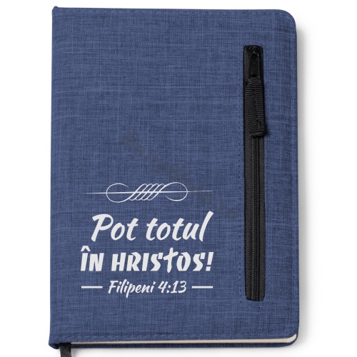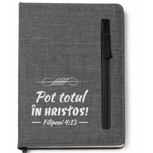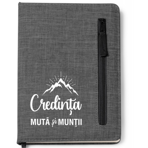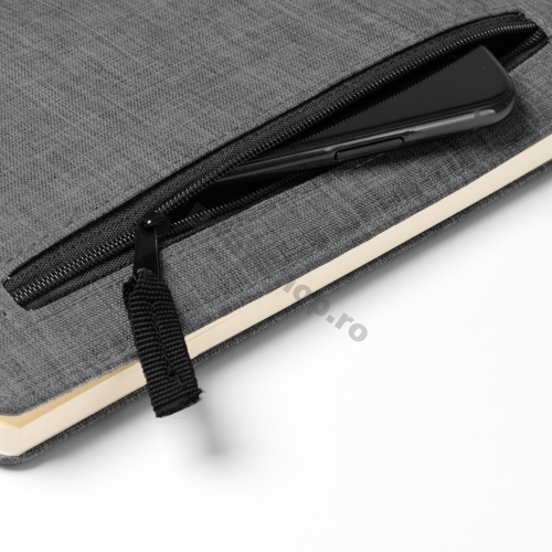 Agenda cu coperta din material textil. Buzunar exterior cu închidere cu fermoar.
