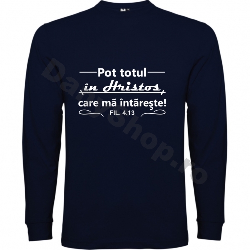 Tricou cu mânecă lungă, fără cusături laterale, cu guler în 4 straturi la baza gâtului și manșete în canalé 1x1.